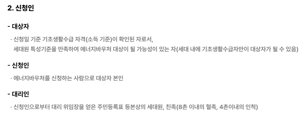 2025년 에너지바우처의 신청 대상은 기본적으로 기초생활수급자 및 차상위계층 중에서 아래 조건을 충족하는 가구입니다. 단순히 소득이 낮다고 해서 모두 지원받을 수 있는 것은 아니며, ‘소득기준’과 ‘세대원 특성기준’을 함께 충족해야 합니다.