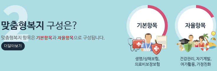 복지 서비스 신청 | 건강검진, 자기계발(교육), 여가활동(여행·문화생활), 가족복지 등 맞춤형 복지 항목 선택 및 신청 가능 |